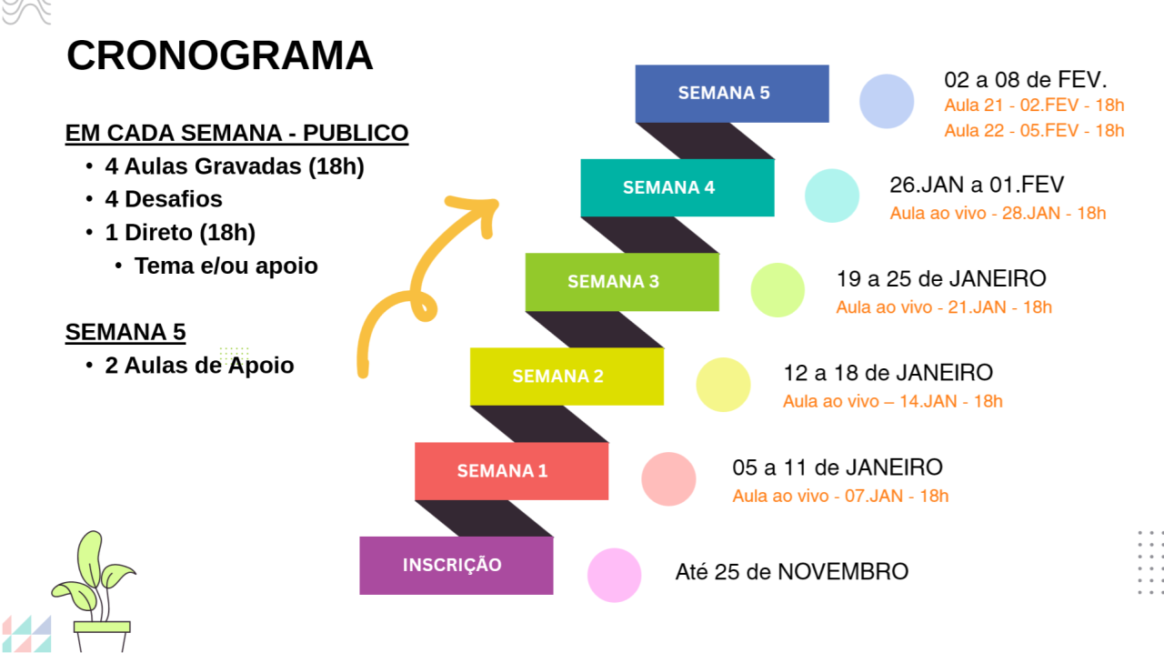 O curso será realizado em formato híbrido entre aulas gravadas (até 1 hora) e aulas ao vivo com a duração de 1h30 a 2h00. Na impossibilidade de estar presente nas aulas ao vivo, é importante referir que todas as sessões ficarão gravadas e disponíveis na plataforma.